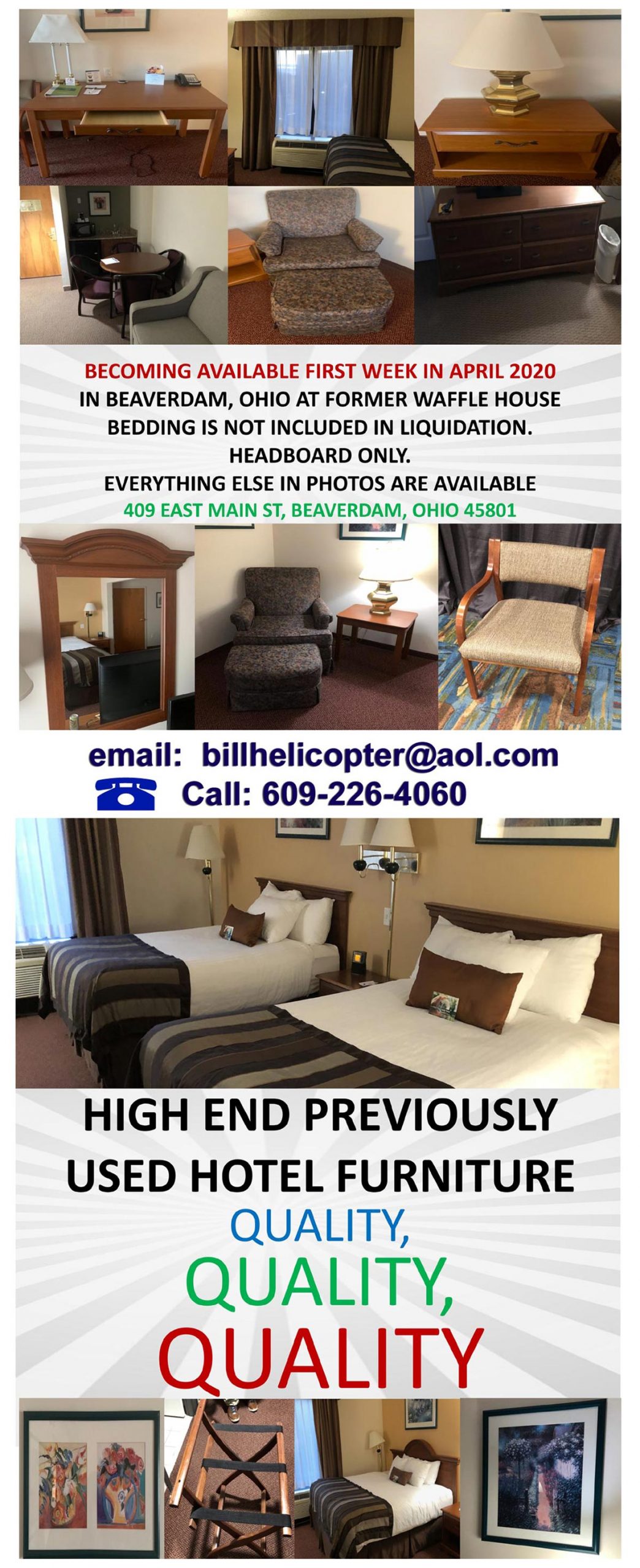High End Furniture Liquidation OVER 1700 PIECES OF HIGH END FURNITURE AVAILABLEPICKUP AVAILABLE STARTING MID-MARCH409 EAST MAIN ST. BEAVERDAM, OHIO 45801CALL NOW: 609-226-4060 Truck & Trailer Liquidation
